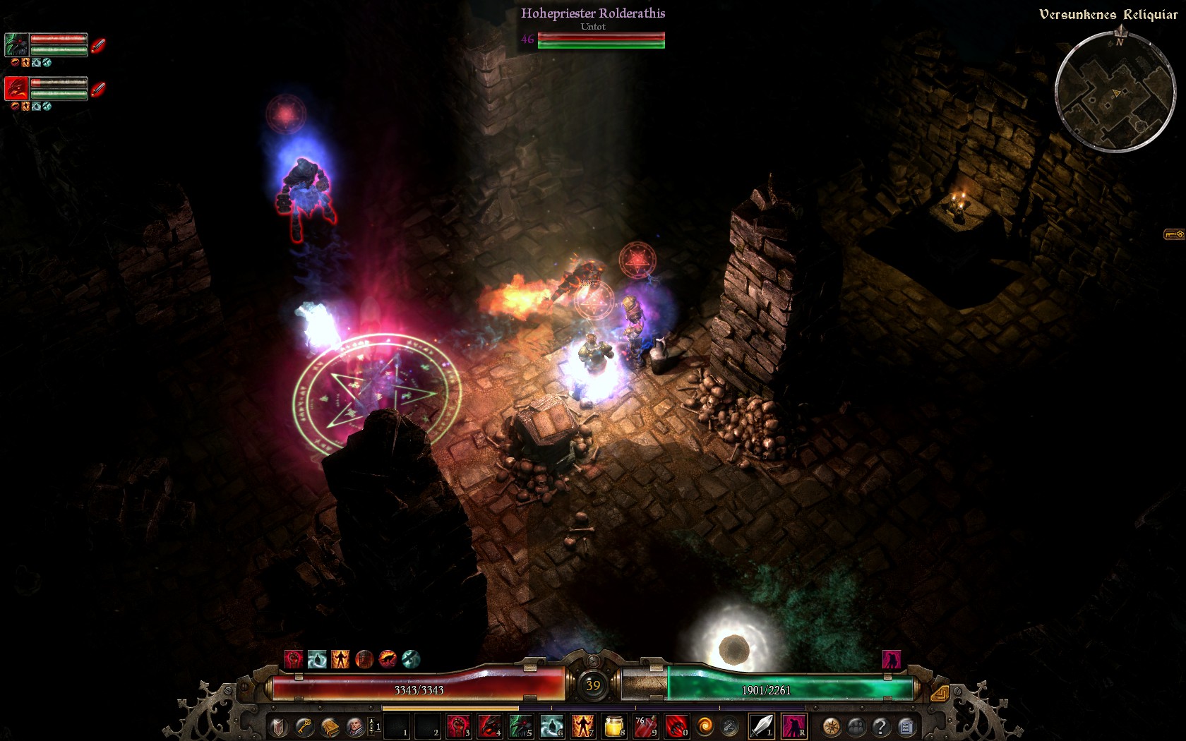Der Priester befindet sich in der Mitte der Gänge. Ihr könnt also erst in Ruhe außen rum gehen und euch um die restlichen Helden kümmern. Als Magier kann man zur Not Pets durch die Wand zu ihm beschrören und mit etwas Geduld die Arbeit machen lassen.